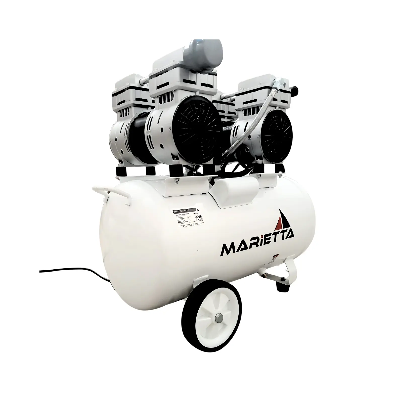 Compresor Marietta 2HP 50L libre de aceite, silencioso (63dB) y robusto. Con doble motor y kit de seguridad, ideal para dental, pintura y limpieza profesional.